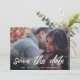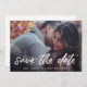 Photo moderne enregistrer la carte de date avec votre image horizontale plein fond avec une superposition de texte. Les mots "enregistrer la date" sont dans une police manuscrite de script de brosse blanche. L'arrière a tous les détails de votre mariage en noir sur un arrière - plan blanc. Un design simple mais élégant qui fait de votre photo la principale caractéristique.