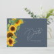 Simple Royal Blue Opulence Sunflowers Wedding Save the Dates - Moderne Floral Elégance avec une touche bohème. Célébrez votre amour dans le style avec nos invitations de mariage rustiques enchanteresses avec des tournesols vibrants dans une combinaison délicieuse de teintes jaunes et bleues royales. Embrassez l'esprit boho avec un design botanique qui capture l'essence de la beauté naturelle. Ces uniques sauvent les dates parfaitement mêlent l'élégance moderne au charme bohème, préparant le terrain pour une fête mariage captivante. Partagez votre joie en famille et entre amis grâce à ces magnifiques invitations sur le thème du tournesol, où la simplicité rustique rencontre le raffinement floral.