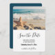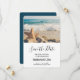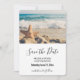 Enregistrez la carte de date avec une photo pittoresque. Une grande étoile de mer dressée sur une plage de sable. Une belle mer bleue avec des vagues de surf blanc en arrière - plan.