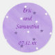 A painting of purple and white stars on a blended lavender background, with Save the date and placeholders for the names and date, printed on stickers. The text is written in purple script. Easily customize on the template form. Great choice for wedding seals. Thank you for shopping at CherylsArt on Zazzle.