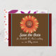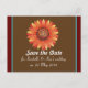 A "Save the Date" sunflowers postcard template. This is an illustration of a sunflower on a red & gold background which allows you to customized colour and text.