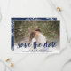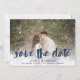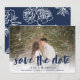 Une carte de save the date moderne avec un style de typographie manuscrit décontracté et frais qui évoque l'apparence d'un marqueur de peinture. Conçue pour accueillir votre photo de fiançailles horizontale ou en paysage à fond perdu, cette carte chic comporte une superposition de texte bleu marine avec vos noms, date de mariage et lieu de mariage sur un dégradé blanc pour un contraste de texte. Les cartes sont imprimées au verso avec un motif de contour floral blanc et comportent un espace pour inclure l'URL de votre site web de mariage ou toute information supplémentaire que vous choisissez.