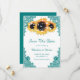Mariage turquoise de tournesol rustique sur mesure enregistrer les cartes de date avec tournesol, lumières à cordes et dentelle fleurie turquoise. Objets correspondants disponibles pour compléter ces turquoises mariage rustique chic enregistrer les cartes de date.