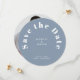 Cercle de typographie moderne classe enregistrer la carte de date avec un texte minimal sur le devant sur un arrière - plan bleu poussiéreux et votre image de choix sur le dos. Customisez cette ronde enregistrer la carte de date avec votre propre photo, noms, date mariage et emplacement. Les couleurs sont personnalisables également.