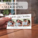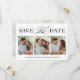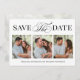 This design features save the date photo card, perfect for weddings, with a modern minimalist style, with a simple black and white, elegant, typography, calligraphy script design, a four photo collage template, a classy classic design.