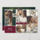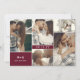 Double face enregistrer la carte de date avec un collage propre de cinq photos sur un côté avec vos initiales et la date du mariage, et une photo plus grande sur l'autre avec plus d'informations sur votre mariage. Moderne enregistrez la carte de date avec un design minimaliste, des polices élégantes et un collage photo. Blanc et vin rouge enregistrer la carte de date avec un design photo propre, vos initiales et date mariage en polices blanches.
