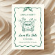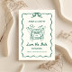 Préparez-vous à annoncer votre mariage de manière amusante et inoubliable avec cette carte "Save the Date" fantaisiste et illustrée à la main ! Parfaite pour les couples élégants d'aujourd'hui, ce design tendance est conçu avec une ambiance décontractée unique qui apporte à la fois joie et personnalité à votre annonce de mariage. L'illustration présente une voiture de mariage classique traînant des ballons en forme de cœur, ajoutant une touche légère qui reflète l'excitation de votre célébration à venir. Encadré par une bordure délicate et ondulée avec un nœud charmant en haut, l'attrait vintage de ce design est renforcé par une couleur verte fraîche et vive, ce qui en fait un choix parfait pour les couples qui aiment allier romance classique et simplicité moderne.