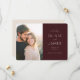 This wedding save the date card features a split design with a warm, candid photo on the left and elegant text on the right. The color palette combines soft yellows and browns from the photograph with a rich maroon background for the text section, creating a harmonious blend of casual intimacy and formal elegance. The typography is clean and sophisticated, with customizable placeholders for names, dates, and locations, ensuring personalization while maintaining a polished look. Perfect for setting the tone for a memorable event, this design captures both the joyous mood and the anticipation of a special celebration.