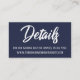 Keep your guests in the loop regarding all your wedding-related details with these pretty, wedding favour insert cards. These pretty cards reflect an elegant, casual style. Elegant text overlays were designed using a modern, bold, casual script font; one side reads "Save the Date" and the other, simply says "Details". Use the template fields to customize these enclosure cards with your personal information. Printed using "business card technology" the handy size will be easy to keep on hand. Mail them with your traditional mailings, and keep a few around to share with those who need an extra or two! The background is covered in a sophisticated navy and this editable colour can be changed to anything from your wedding palette that you choose; all text is white. // 89 // Designed by Melody Watson for Paper Muserie.
