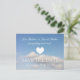 Save the date wedding postcard | white clouds sky. Coloured photo image with romantic blue sky with white clouds and heart. Great for reminding guests of your wedding. Personalizable bride and groom name with elegant script text.
