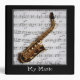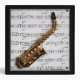 A striking image of a golden saxophone resting on a music sheet, framed in the centre of a deep black background for maximum contrast and elegance. Perfect for music classrooms, practice rooms, or as a unique gift for saxophonists and jazz lovers. Also available as a poster, T-shirt, and other products.