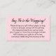 If you're hosting a no-gift-wrap display baby shower for the new mommy-to-be, this simple card could be the choice for you. Using a pretty, modern script font, I first added a header that announces the intention in a mildly cheeky way: "Say No to the Wrapping!" on the front, and "to" and "from" for the gift tag side. The template field was set up to offer instructions for guests not wrapping their present; please feel free to change the wording in any way you wish. All fonts and colours can be modified as you see fit.