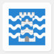 “Azure, a tower argent surmounted by three bars wavy counterchanged, all within a bordure argent.”
