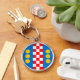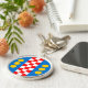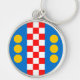 "Azure, a pale checky gules and argent between six bezants in pale three and three." Branch officer badge for the exchequer of a group within the Society for Creative Anachronism.