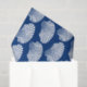 Tissue paper in a block print pattern, based on a scallop shell, in white on a navy blue / indigo background