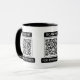 This two-tone mug showcases a QR code design the words "Scan Me For Repentance" in a Moonshine print font displaying white letters with black background displaying a typograph style with a QR code linking to "Acts 3:19-20" KJV bible scripture in the centre of this faith based quote theme from the King James bible. The rim & handle are glazed in matching colours available in 11-ounce or 15-ounce sizes microwave and dishwasher safe ceramic construction.