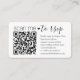Simplify RSVP responses and provide any important details with chic modern QR Code enclosure cards. All text is simple to customize, including wording that reads "scan me to rsvp". To make your own QR code using the generator, simply type the website URL into the template. By scanning the card with their phones, guests are sent directly to the wedding website to reply to the invitation. An online rsvp process reduces the chance that cards will be lost in the mail. It's also more versatile, in that you can ask for more detailed information, such as meal choices, food allergies, and song requests. All response information can be personalized or deleted. The black and white design features a cute heart, modern minimalist typography and handwritten script calligraphy. This card is a stylish way of asking wedding guests to kindly reply to your upcoming special day celebration.