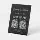 Chic black pedestal tabletop sign for your business featuring your name or brand showcased in a stylish white signature script, your business type or title, 2 QR codes for customers to scan for contactless payment, and your phone number and street address or other text in clean white lettering.