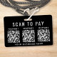 Modern black badge for your business to collect payments on the go with the option to upload 3 QR codes for different contactless payment apps for customers to scan for payments. Upload your QR codes and add your business name in simple white lettering.