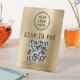 Modern table top pedestal sign for your business with your QR code for customers to scan for payment. Add your logo, QR code, phone number and street address in simple typography against a gold faux brushed metallic background.