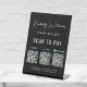 Chic custom black pedestal tabletop sign for your business with Venmo, Paypal and CashApp QR codes for customers to scan for payments and your name or brand showcased in a stylish white ignature script. Upload your QR codes and add your contact information in clean white lettering.