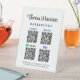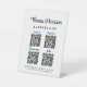 Custom pedestal tabletop sign for your business with your name or brand in a stylish signature script and Venmo, Paypal, Zelle and CashApp QR codes for customers to scan for payments. Upload your QR codes and add your contact information in clean simple lettering.