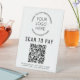 Simple modern table top pedestal sign for your business with a QR code for customers to scan for payments. Add your company logo and QR code, and you business name, phone number and street address in simple typography.