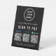 Simple black table top pedestal sign for your business with Venmo, Paypal and CashApp QR codes for customers to scan for payments. Add your logo, QR codes, and business name, phone number and street address in simple white typography.