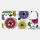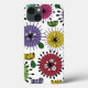 This phone case has a Scandinavian-inspired design of flowers made from circles, ovals, and half-circles with starbursts on them and leaves in periwinkle, yellow, green, turquoise, magenta, rust, and blue.
