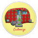 Cute rounded caravan travel trailer with a gnome in a green outfit, to customize, personalize by changing to your name on any background colour