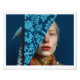Nordic/Scandinavia winter holiday postcard, a blonde woman with red lips, blue floral patterns, diptych with a winter bird. Traditional outfit, dress. Norway, Sweden, Finland, Minnesota, Wisconsin.