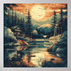 This poster captures the peaceful beauty of a mountain retreat in a retro, Scandinavian-inspired style. The design features a cozy lakeside cabin surrounded by majestic pine trees and rolling mountains under a vibrant, setting sun. Using a clean, mid-century modern aesthetic, the artwork's rich, earthy colours and simplified forms evoke a sense of quiet tranquillity and a deep connection to nature. It's the perfect piece for anyone who loves the outdoors, vintage design, and the serene feeling of a peaceful escape.