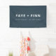 Simple, stylish custom wedding banner in a modern minimalist scandi scandinavian design style with a contemporary typography in white on a dusky smoke blue background in an informal casual style. The text can easily be personalized for a unique one of a kind wedding favour for your special day.