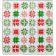 This shower curtain has a Christmas design of different snowflakes in red and green in rows.