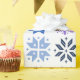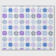This wrapping paper has a winter design of different snowflakes in blues and purples in rows.