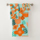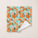 This towel set has a Scandinavian design of flowers and leaves in various shades of orange and teal.