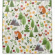 Scandinavian folk art style nature illustrations (woodland; fox, leaves, trees, flowers, mountains and birds) in a surface pattern design on a light cream colour background.