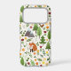 Scandinavian folk art style nature illustrations (fox, leaves, trees, flowers, mountains and birds) in a surface pattern design on a light cream color background.