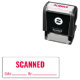 This business self-inking stamp is a text template. You can edit the text to show a custom message. (Shown: SCANNED Date: By:) There are blank lines next to the text for date and by so that you can write that information after stamping if desired.
