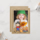 Send warm autumn greetings and an updated photo of your little one to family and friends with this delightful design. The burlap background has a smiling scarecrow and a wagon full of pumpkins. Plenty of room in the back for a lengthy message.