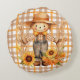 A round pillow featuring a scarecrow on a brown and orange gingham plaid pattern. Would make a beautiful addition to your home in the fall or for Thanksgiving decor. Makes a great gift for friends or family.