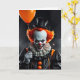 Scary colourful psychedelic comic book style clown holding a balloon Halloween card. With inside pun and colouring page.