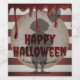 These spooky custom Halloween wine bottle labels labels feature a creepy carnival theme. A shadow of a scary clown holding a balloon is printed across the centre. A vintage style, circle parchment paper carnival poster is featured in the background, over a red and white striped pattern. Blood is dripping across the top portion. The greeting "Happy Halloween" is printed across the top in a blood red, sinister font. A sample family name is printed above the clowns, which you can personalize to include your own custom name or text.