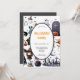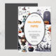 The design features everything spooky from a black cat with flying bats to a spider's cobweb, ghosts, a witches broomstick, skull & bone, magic glass ball and a jack-o-lantern pumpkin all in black, white, grey and orange colours. The template wording is easy to personalize and your party guests will be in for a scare when they receive these invites in the mail!