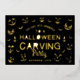 Announce your spooky Halloween pumpkin carving party and invite your guests with our scary jack-o-lantern carving pumpkin faces. Our design features different glowing scary pumpkin carving faces peeking through the darkness in gold foil. Bats and waxed candles add to the scary Halloween invitation. The reverse side features the spooky Halloween pumpkin carving faces with the details of Halloween placed in the centre. All illustrations contained in this spooky Halloween pumpkin carving invitation are hand-drawn original artwork by Moodthology. You can customize the text size, text colour, font, and layout for your own personal design preference.