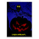 Very scary looking pumpkin with an owl in a tree above. A moody deep blue night time sky background. Very fun and scary design for your Halloween greeting card.