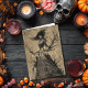 Set against aged parchment in rich sepia tones with dark vignette details, this card evokes the timeless spirit of old-world witchcraft and vintage horror posters. Perfect for sending mysterious Halloween wishes, witches, or dark fantasy aesthetics.