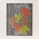 Fall coloured jute leaves arranged on weathered fence boards gives texture and interest to the artwork. Fun puzzle that would make great wall decor when mounted and framed. The original photo is masked to blend seamlessly with a variety of backgrounds.