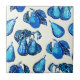 Ceramic tile in a print of scattered pears and leaves, adapted from vintage botanical art, digitally enhanced and coloured, in deep indigo and shades of denim blue on white