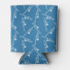 Trombone themed can cooler with white trombones on a blue background.